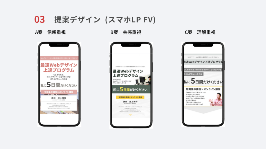 5日間WEBデザインチャレンジプログラム FV 投稿日: 2026年2月8日2026年2月8日 投稿者: semba タイトル:「5日間WEBデザインチャレンジプログラム FV」 目的:無料のWEBデザイン5日間チャレンジに参加してもらうこと。チャレンジ後には、最後に講座案内もする予定。 ターゲット:40代前後 男性女性。割合は30対70。WEBデザインに興味がある人。 使用ツール Photoshop/ChatGPT・AI OGAMI君 制作プロセス 3案ご提案、修正後A案(信頼重視)をJpeg にて納品。